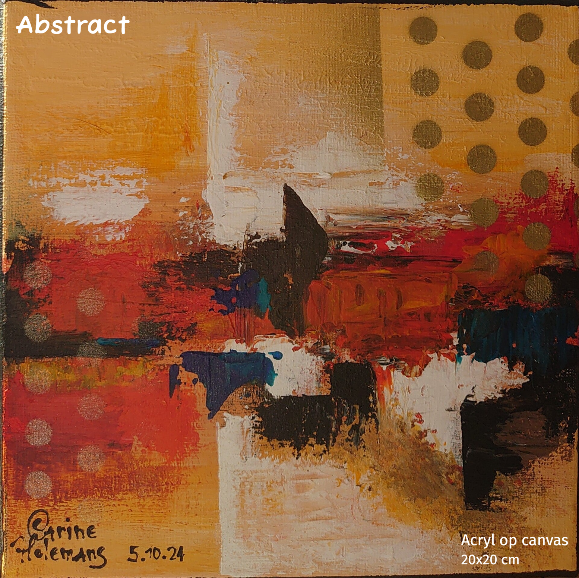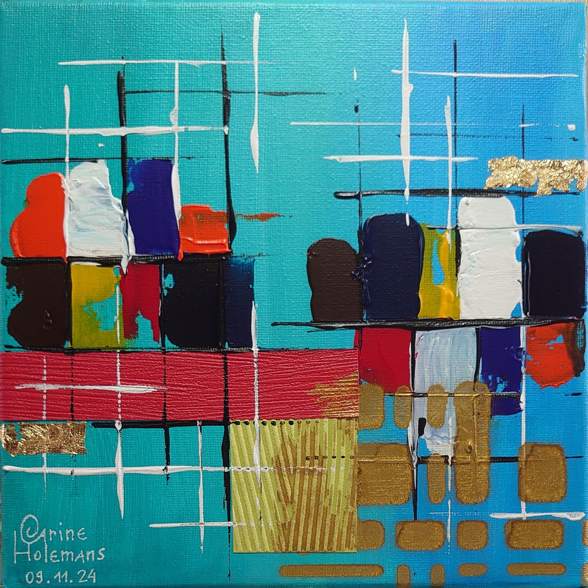 Kleurvlakken en lijnen zoeken elkaar op binnen een helder turquoise veld. Gouden accenten vangen het licht en brengen rust in de beweging. Dit werk is een samenspel van ordening en vrijheid.