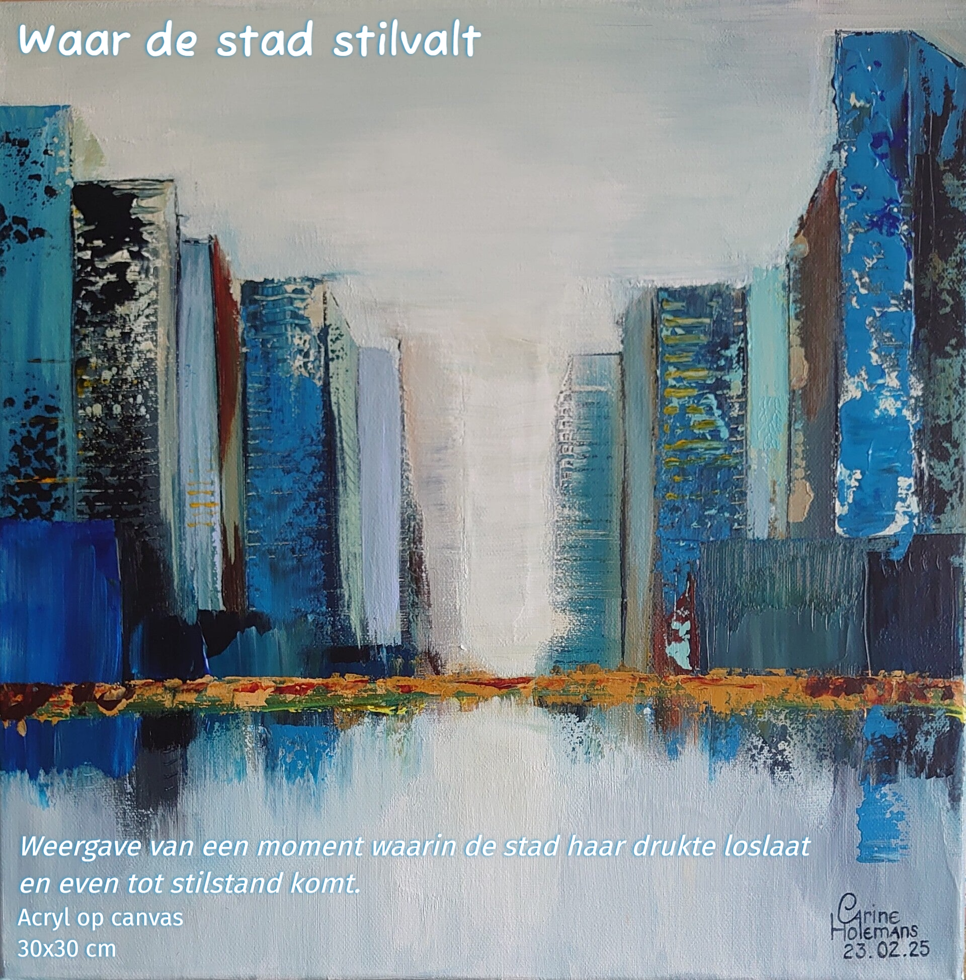 In 'Tussen water en licht' ontmoeten diepe blauwtinten en warme aardkleuren elkaar langs een denkbeeldige horizon. Licht breekt door lagen verf en textuur, alsof water en lucht in elkaar overvloeien. Het werk nodigt uit tot verstilling en eigen interpretatie.