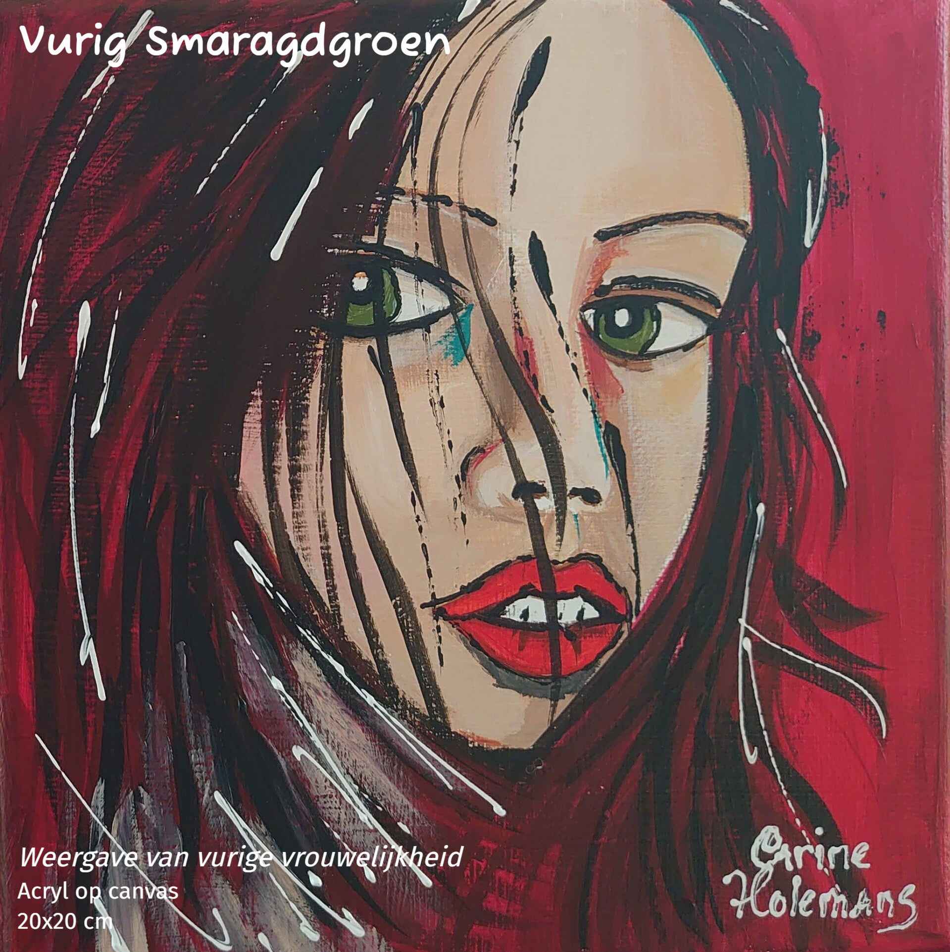 Een krachtig en intens werk, met vurige tinten en smaragdgroene ogen. Een spel tussen contrasten van zachte en harde lijnen, waarbij de emoties van het moment voelbaar worden in de expressie en kleur.