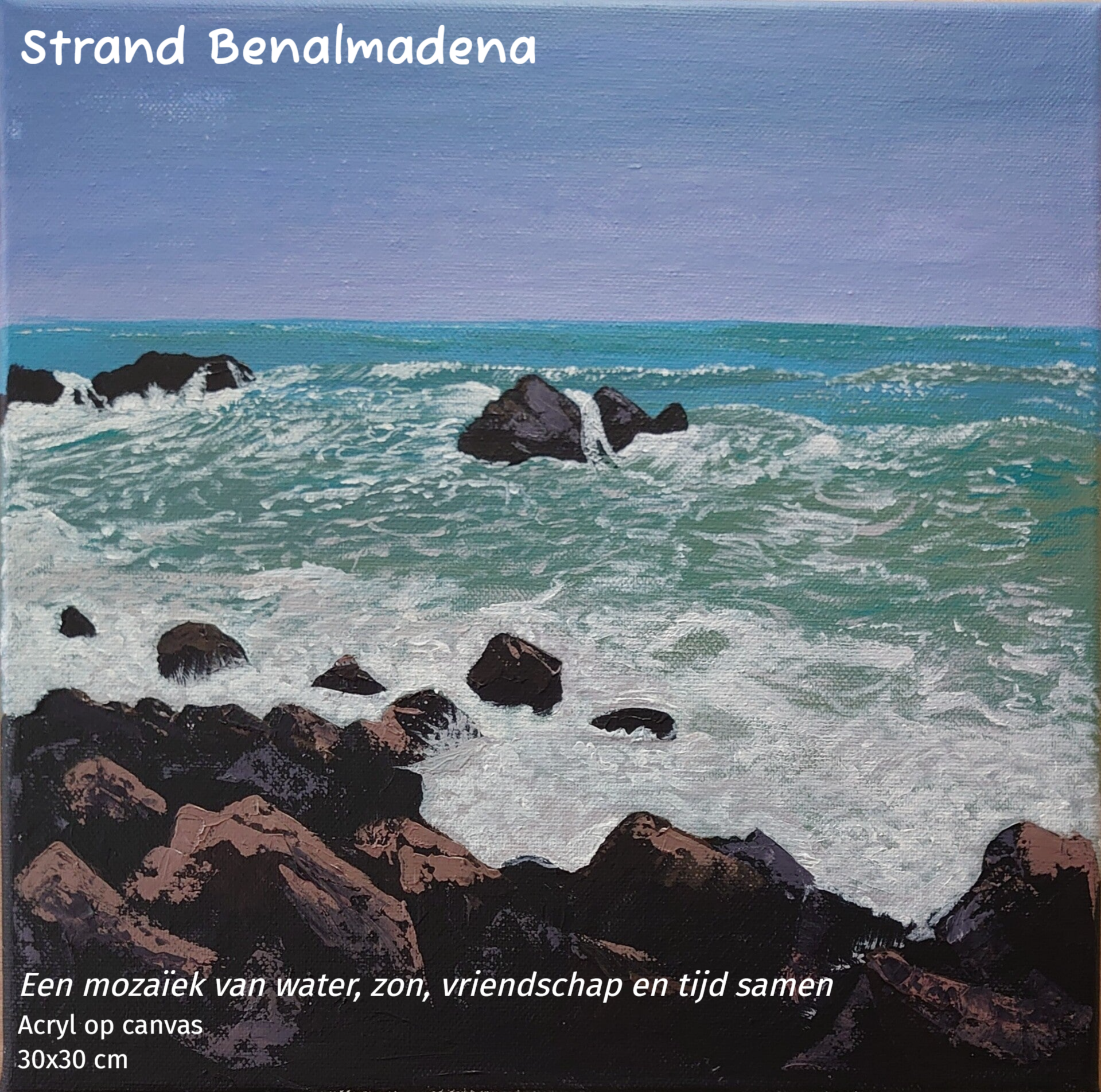 verbeeldt de kracht en rust van de zee, geschilderd naar een vakantie met vrienden. De golven slaan tegen de donkere rotsen, terwijl de horizon open en licht blijft. Het werk vangt een moment van samenzijn, vrijheid en het ritme van de zee dat nog lang blijft nazinderen.