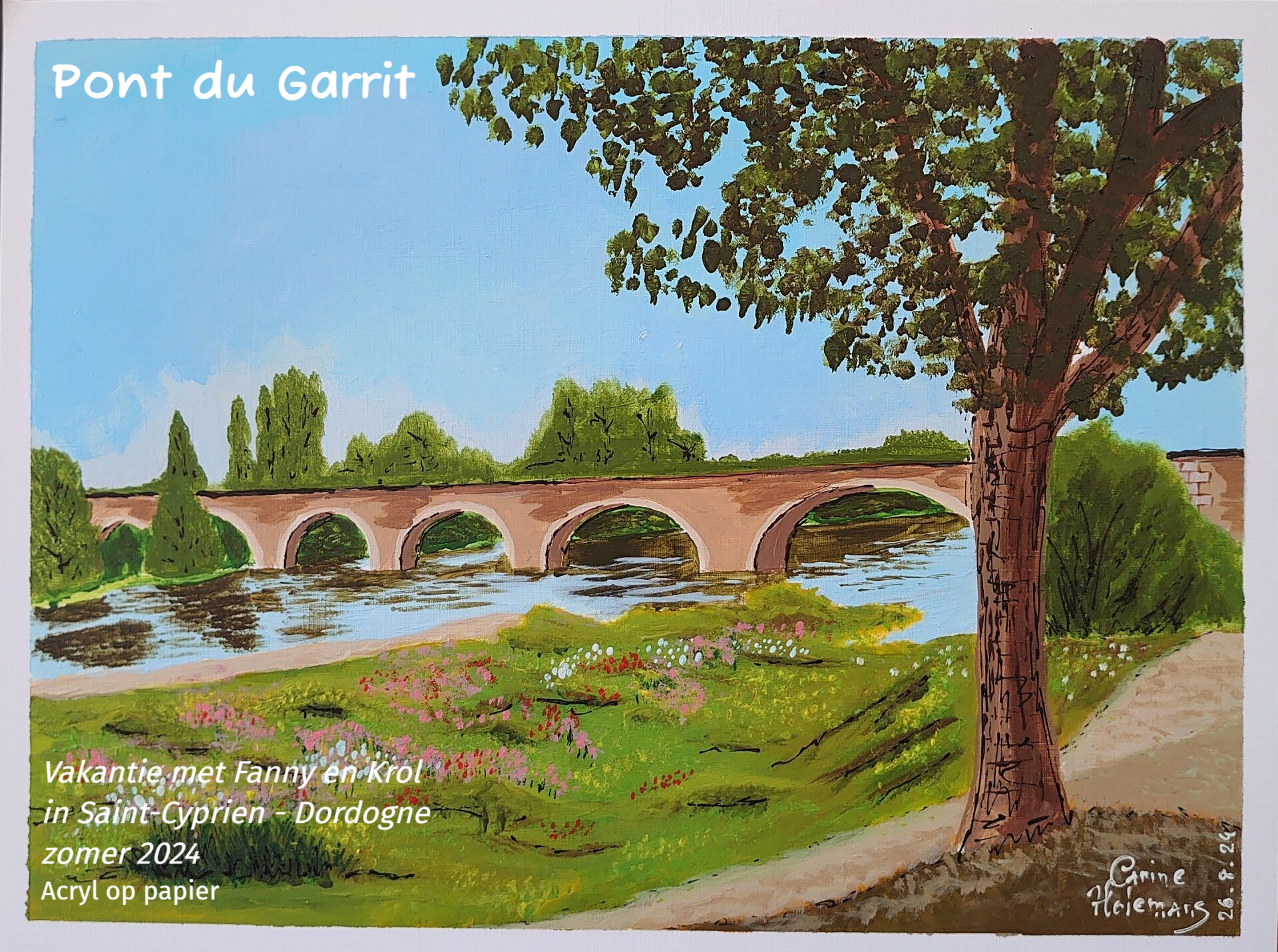 Dit schilderij toont een zomerse dag aan de Dordogne bij Saint-Cyprien. De Pont du Garrit verbindt landschap en herinnering, badend in licht, groen en stilte. Een moment van rust, vastgelegd tijdens een vakantie in Frankrijk met Fanny en Krol en voor Fanny en Krol.