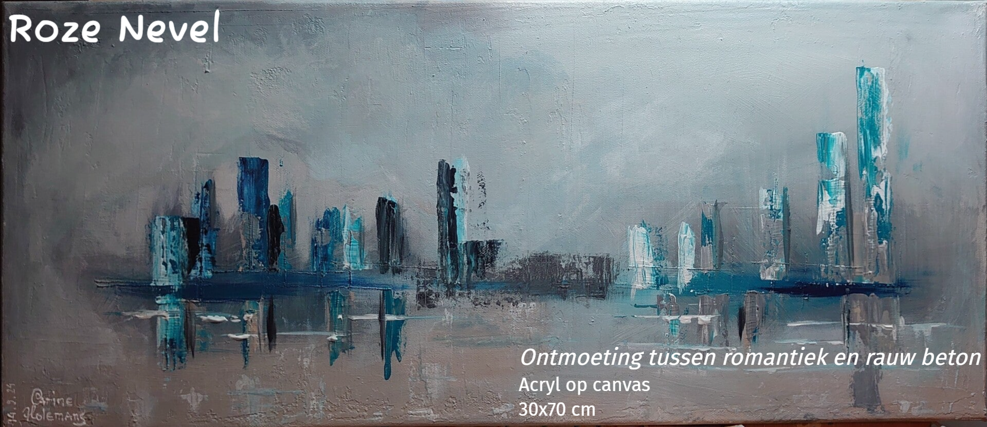 In 'Roze nevel' rijzen vormen op uit een stille waas. Verticale lijnen doen denken aan een verre stad, weerspiegeld in water of herinnering. Kleur en structuur vervagen de grens tussen werkelijkheid en gevoel, alsof het landschap zich langzaam oplost in licht en tijd.