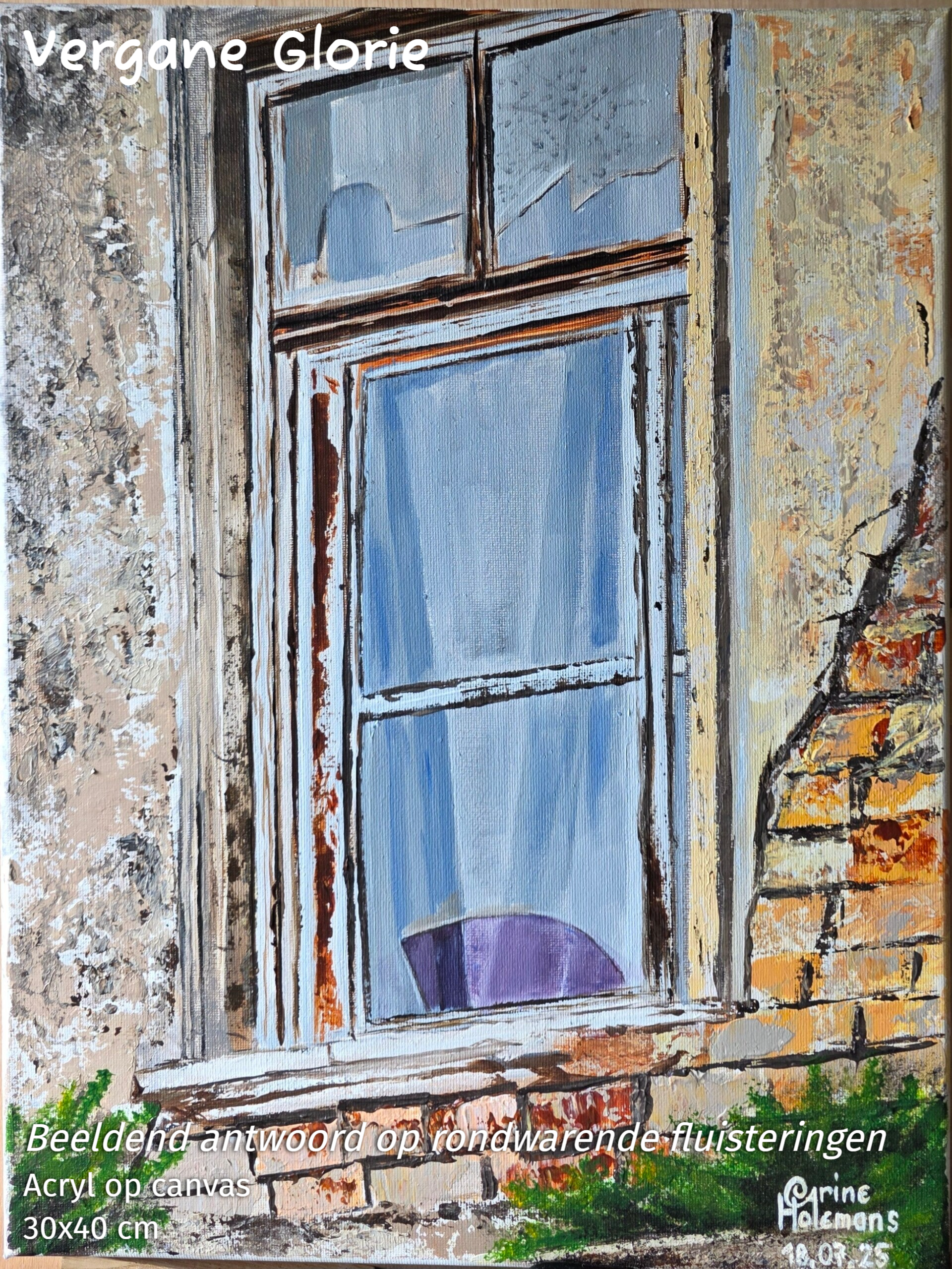 Een verweerd raam in een oude gevel, geschilderd met aandacht voor textuur en licht. De sporen van tijd blijven zichtbaar, terwijl het glas een moment van rust en verstilling bewaart.